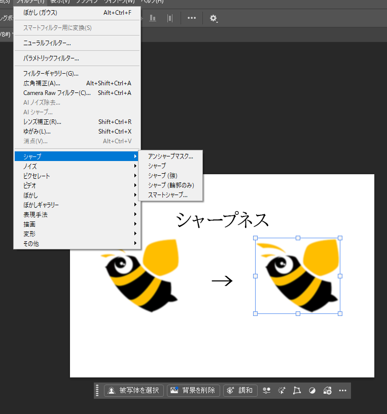シャープの中でもPhotoshopの「スマートシャープ」といった、より細かく調整できる機能がおすすめです。