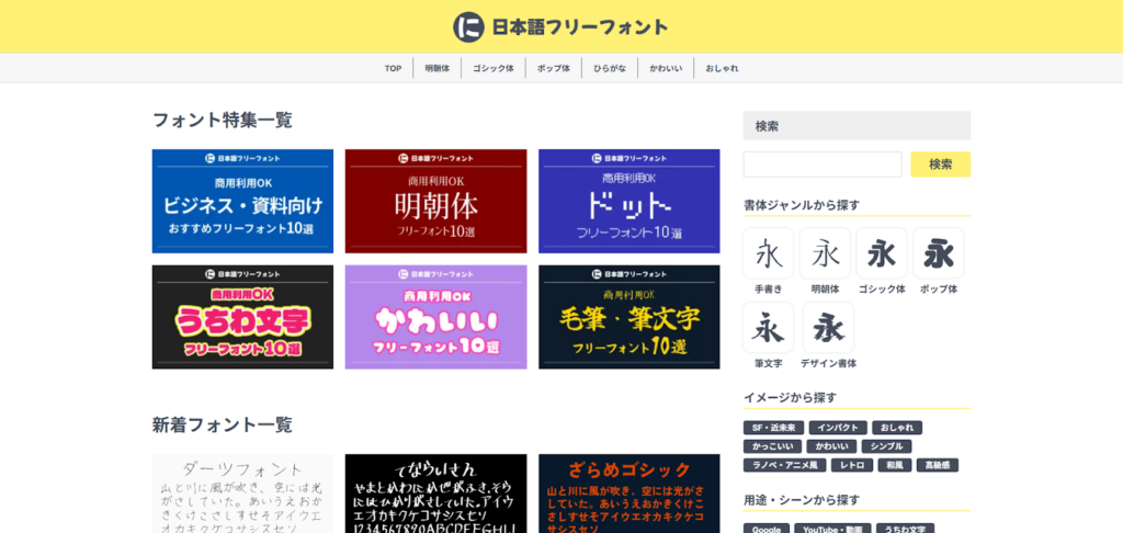 日本語フリーフォントは、探したいフォントの条件がはっきりと決まっているときに、とても頼りになるサイトです。
