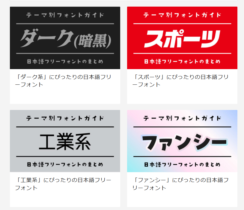 「どんなフォントを使えばいいかわからない」と迷ってしまったときは、まずこのサイトのテーマ別ページを覗いてみると、制作のヒントがきっと見つかりますよ。