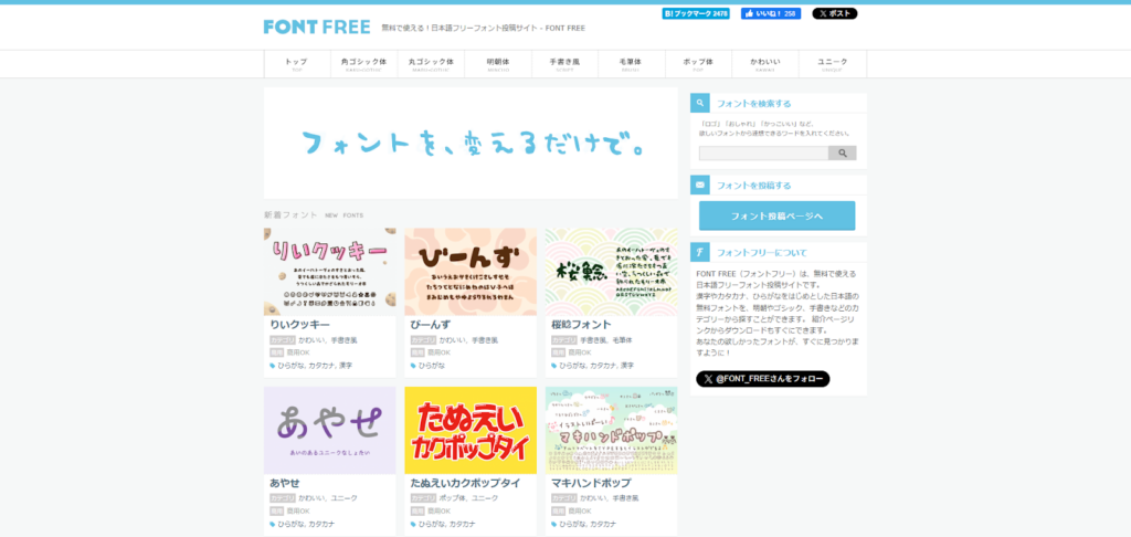 FONTFREEは、サイトを開くと新着順にフォントがずらりと表示されるので、ただ眺めているだけでも「こんな新しいフォントが出たんだ!」という発見があってワクワクします。